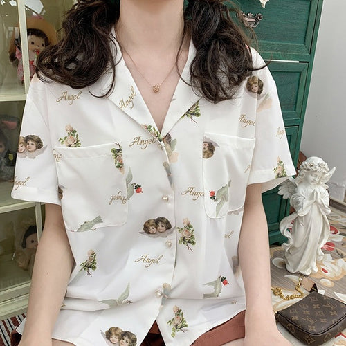 HOUZHOU Harajuku White Blouses Women Short Sleeve Sweet Vintage Shirts