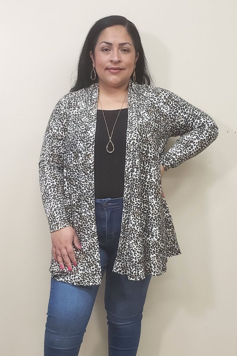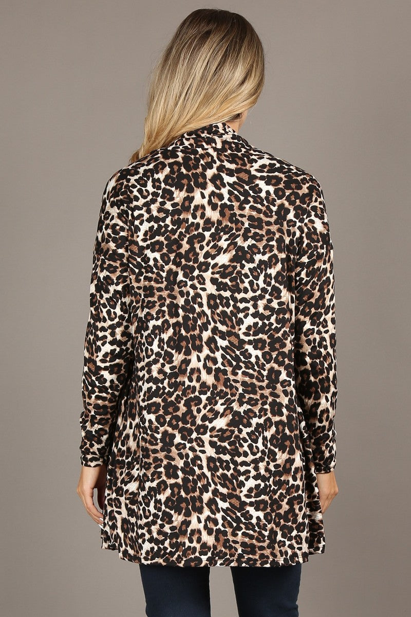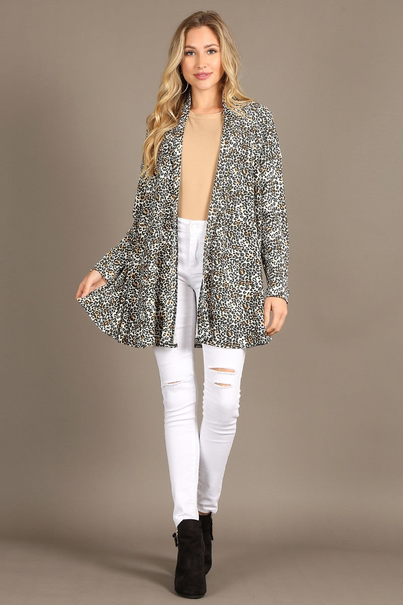 Cheetah print French terry, long body cardigan in a loose fit with an open front and long sleeves. 87%polyester, 10%rayon, 3%spandex- French Terry. Manufacture in U.S.A.