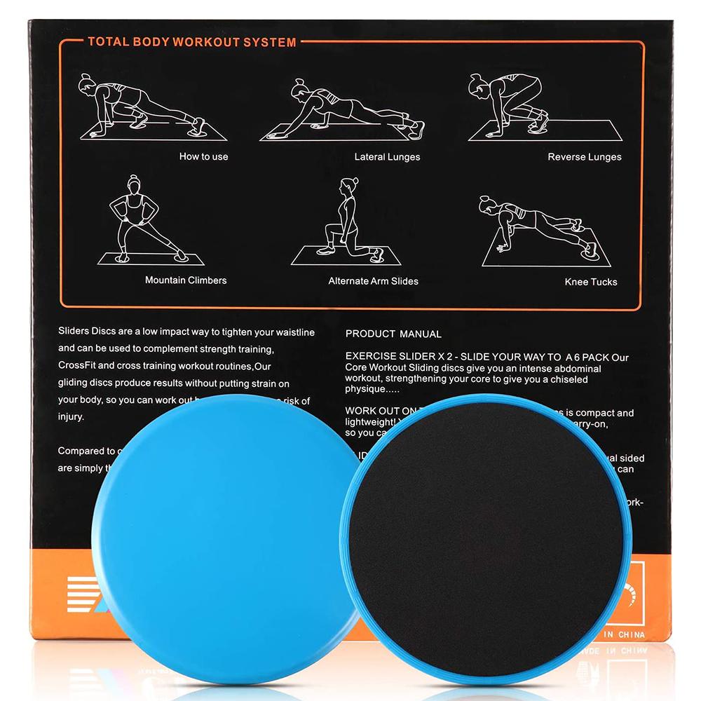 This package includes 2 Core Sliders in Pink(or Blue/Black). Each slider is 7 inches in diameter and is accompanied by a color-printed exercise manual describing 5 different exercises you can do with them.
