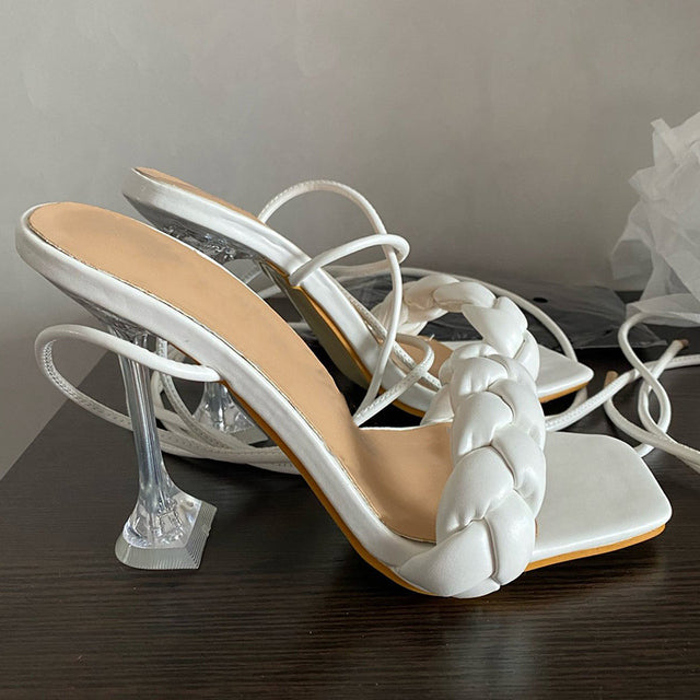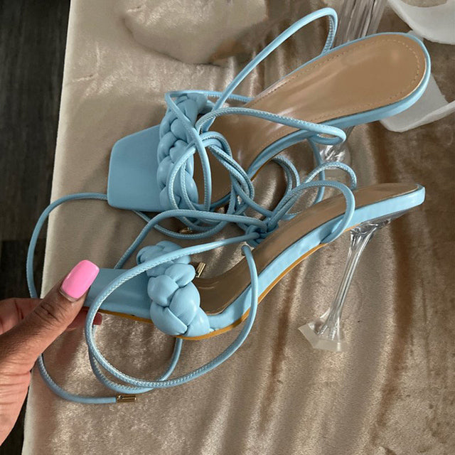 2021 Summer Designer Women Weave Blue Clear Heels Sandals 9cm Fetish High Heels Lace Up Sandals Open Toe Prom Shoes Plus Size