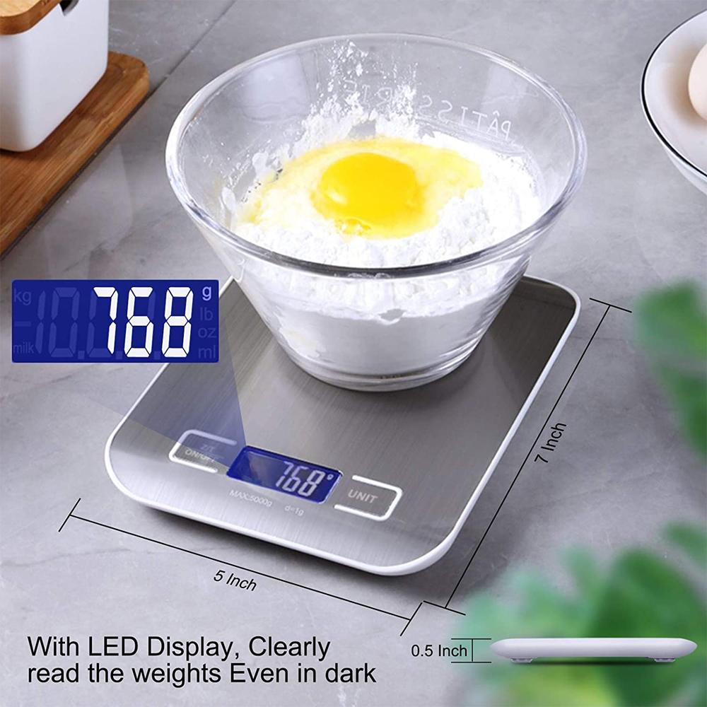 4 Upgraded Weighing Sensors; Weighs food from 1g/0.1oz to 5kg/11lb, satisfying muilti needs. whether weighing a small amount of seasoning or a heavy cut of beef, it will show you the most accurate weight of things you put.
