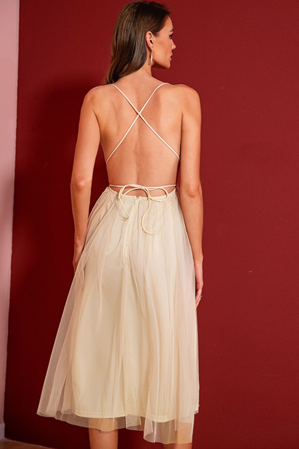 - Features: Sleeveless, backless, crisscross back, tie back, slit, tulle