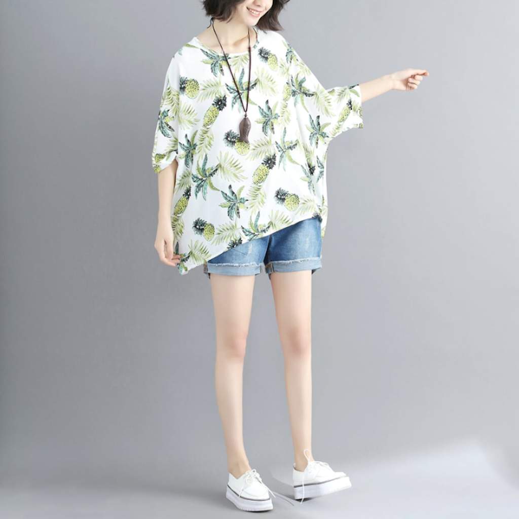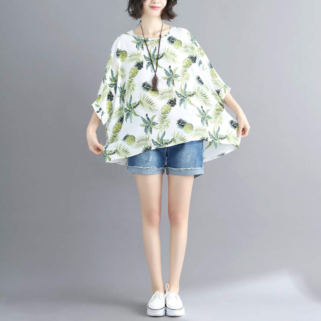 Womens Tropical Pineapple Print Batwing TopFabric: PolyesterFit: Loose FitColor Available: WhiteSize: Free Size (Fits Medium)Shoulder : 14 " - Sleeve : 16 "Chest : 62 " - Length : 26 - 28 "**Measured lying flat, please leave extra room for clothing. There may be slight differences in measurements.
